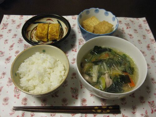 ↓ 今日の夕食。ごはん、鶏肉と春雨の中華スープ(鶏肉、春雨、にんじん、しいたけ、えのき、わかめ、ねぎ)、だし巻き玉子(ツナ入り)、絹揚げ豆腐の煮付け。 娘は麺類が好きなので、スープに春雨を入れてみたらよく食べた。お弁当は26日から。朝、毎日の…
